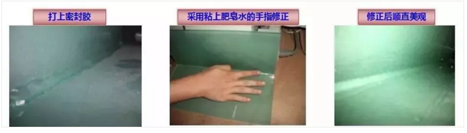 在打密封胶的边沿限位位置粘上封口胶或纸胶带,打上密封胶后,用粘上肥皂或香皂水的手指修正表面,最后拆除封口胶或纸胶带(该方式能达到密封胶表面顺直美观且密封胶不粘手的效果)。