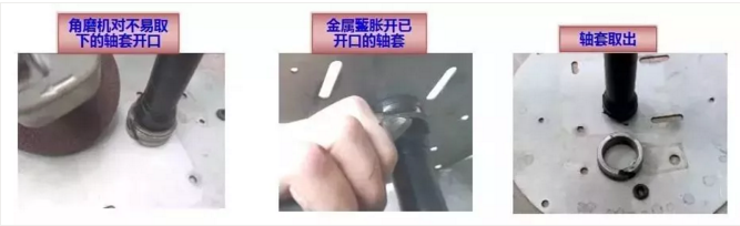 常遇轴承损坏轴套不易取下的现象,可用角磨机将轴套开口,然后用金属錾胀开轴套即可。