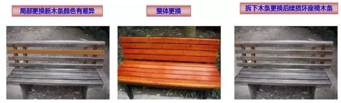 可采取将该座椅木条整体更换,拆下的可用木条保留用于后续相应座椅木条损坏后的更换维修,弥补同一座椅木条色差影响品质的问题。如下图: