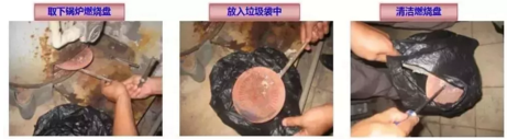 准备一垃圾袋(大小选择需能轻松容入燃烧盘),取下锅炉燃烧盘,放入垃圾袋中对燃烧盘进行清洁,避免燃烧盘碳灰等污物四面散落污染户内成品、不便清洁等问题。