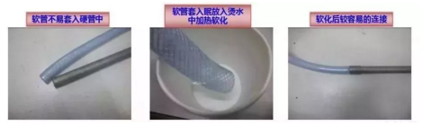 对软管采取烫水加热软化或者在硬管表面涂上肥皂等润滑剂,软管即容易连接套入硬管。