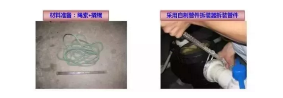 在对圆形给排水接头拆装维修中,若单纯采用管钳等常用工具处理易损伤管接头且不易有效拆装,同时因配置管钳等常用工具规格的局限性,并不能满足所有管件拆装需求,如图:通过绳索+撬棍的合理搭配组合为圆形管件拆装器,有效解决了上述难题。