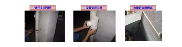 在主管道不便维修或整改前提下,若主管道不便处理可采取在单元排水管的易堵塞部位前端与返水口之间加装溢流管的方式。