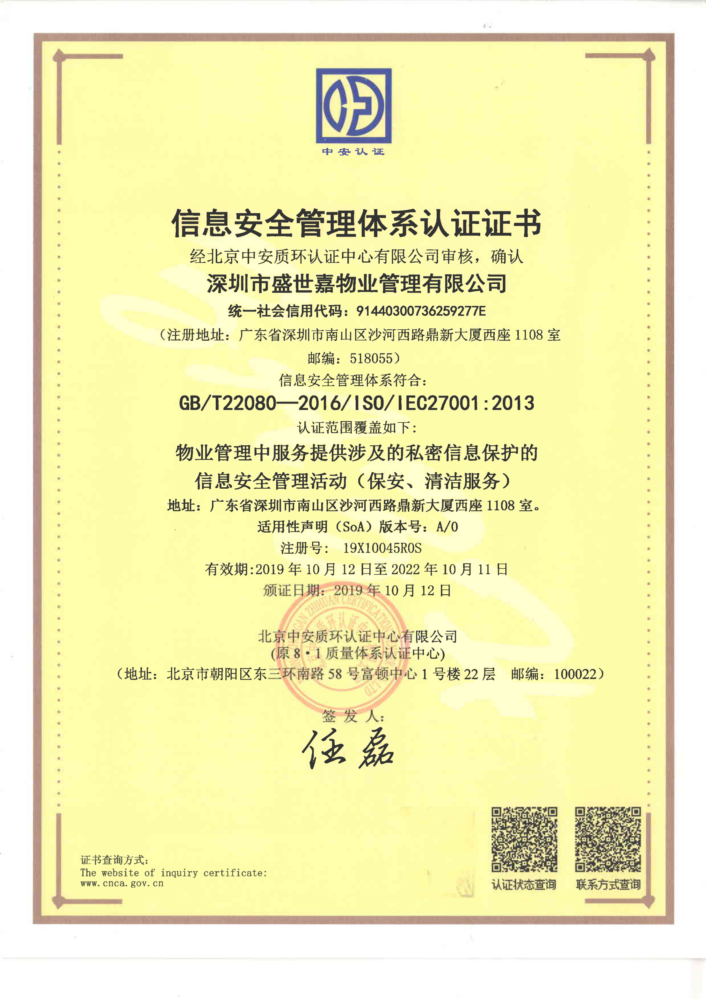 2019年5月,盛世嘉物业公司启动了信息安全管理体系(GB/T22080—ISO/IEC27001:2013)认证工作,10月完成认证审核工作并取得认证证书,体系涵盖范围:物业管理中服务提供涉及的私密信息保护的信息安全管理活动(保安、保洁服务)。