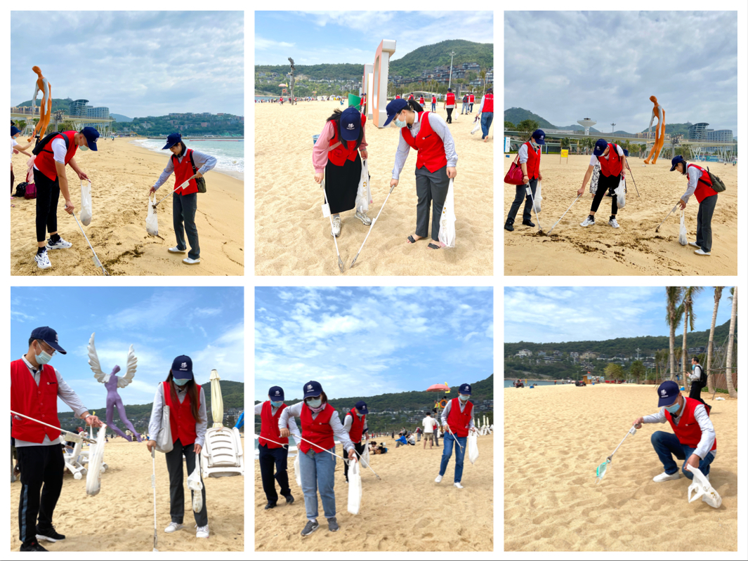 参加活动的人员分成三个小组,手持垃圾钳及可降解塑料袋投入到环保活动中去。全体人员全神贯注、一丝不苟地捡拾沙滩上的包装纸、烟头、水果皮、瓶盖等生活垃圾,不放过任何一个要“收拾”的目标。海滩上一位位身穿“红马甲”的盛世嘉人工作热情满满,前来旅游的游客不禁投来赞赏的目光。