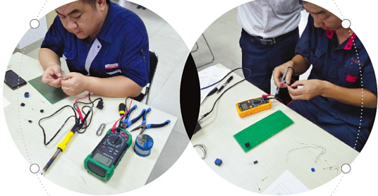 接着,是工程模块终审决赛,只见现场个个能工巧匠不甘示弱,你追我赶,展现出工程人员们的绝对实力范儿!终审项目“延时开关电路”,看似简单的基础项目,考验着参赛者的耐心、细心。工程部吴经理认真检查、仔细测量,奔波于各参赛者之间,忙得不亦乐乎。