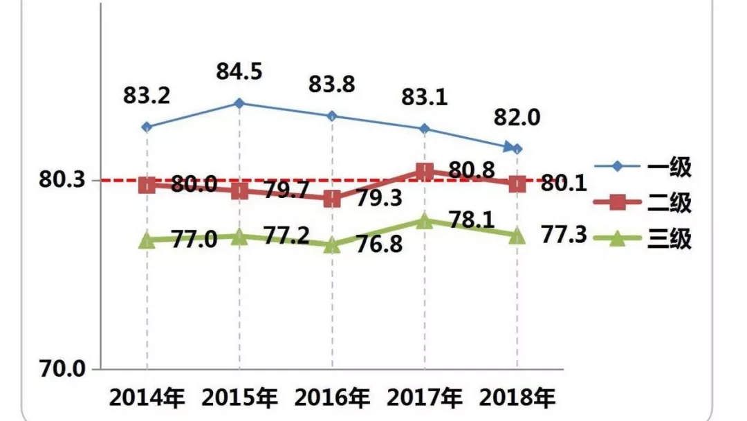 调查结果显示,就不同资质的物业服务企业来看,2018年一级资质企业的满意指数为82.0,二级资质企业为80.1,三级资质企业为77.3。从各项指标来看,一级资质企业各项指标的满意指数均高于二级、三级资质企业;二级资质企业各项指标的满意指数均高于三级资质企业,但总体上来看,各级资质企业的满意指数差距呈现逐渐缩小的趋势。