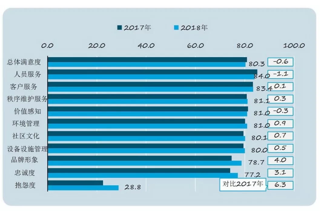 调查显示,2018年度物业管理业主满意度深圳指数为80.3,较2017年下降了0.6,且继续维持在较好水平。为提高物业服务质量,我市物业服务企业从新技术运用、跨界合作和社区经济发展等方向进行可探索。随着科技应用的扩大,业主对物业服务多样性和高层次的需求得到满足,所以深圳指数虽然略有下降但仍然维持在较高水平。