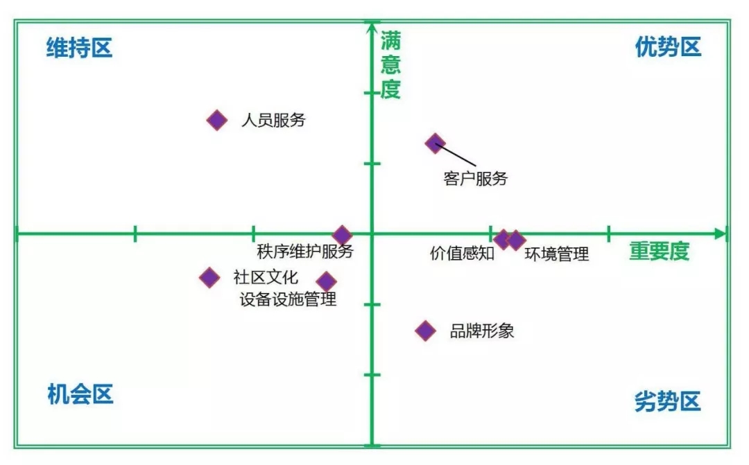 根据调查结果,环境管理和价值感知是影响业主满意指数的关键性驱动因素,对提升业主满意指数有较大影响。另外通过重要度-满意度矩阵图可以看到,环境管理和价值感知均位于劣势区,有较大的提升空间。