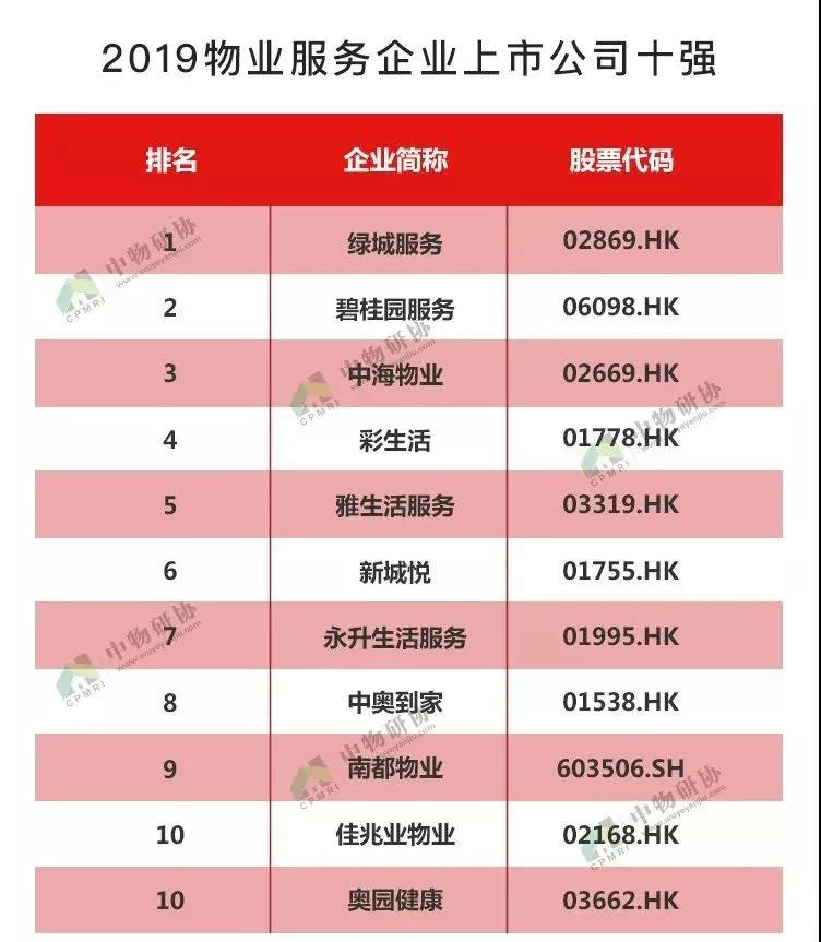 根据2019物业服务企业上市公司测评研究报告,绿城服务荣登榜首,碧桂园服务、中海物业紧随其后,位列第二和第三名。彩生活、雅生活服务、新城悦分别位列第四至第六名;永升生活服务、中奥到家、南都物业分别居于第七至第九名;佳兆业物业、奥园健康并列第十名。