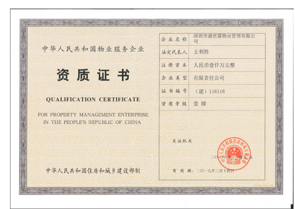 日前,传来喜讯,深圳市盛世嘉物业管理有限公司顺利通过了严格的评审,正式取得国家建设部批准颁发的“国家壹级资质物业服务企业”证书。此资质经过公司一年多的积极申报,于深圳市盛世嘉物业管理有限公司将成立十四年之际获此殊荣,意义非凡。