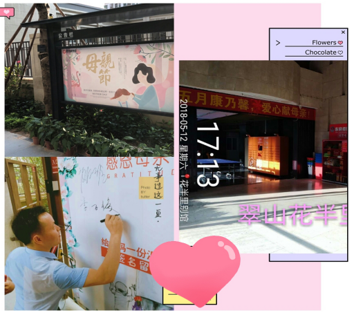 母亲节前夕,留仙居管理处在各楼层张贴了“感恩母亲·情动留仙,美味见孝”的宣传单,宝亭锦园管理处在公告栏张贴了一张主题为“感恩母亲”的宣传海报,翠山花伴里管理处也早早就挂上了“五月康乃馨,爱心献母亲”的横幅,盛世嘉各小区内充满了“母亲节”节日的氛围。