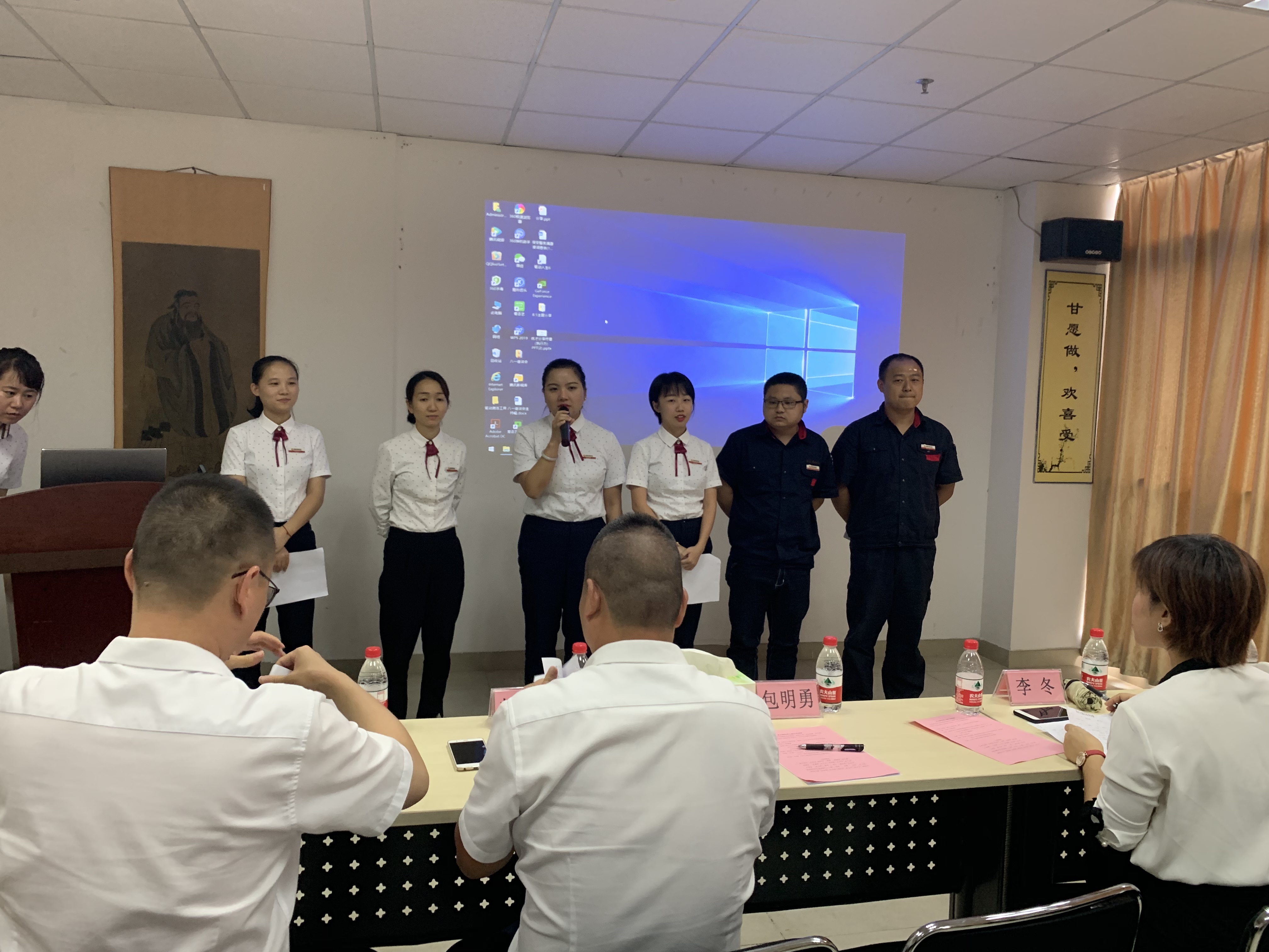 通过抽签的形式,每个小组轮流上台进行了小组队名、口号展示、以及分工说明。“荣誉来自努力,进步来自勤奋;每天进步一小步,日积月累跨大步”、“不苦不累,人生无味,不拼不博,人生白活,拼搏队,加油!”、“高调做事,低调做人,平凡也优秀,耶!”、“升级打怪做boss”,整齐嘹亮的声音、饱满的精神面貌、各有特色的团队展示,让评委们眼前一亮。