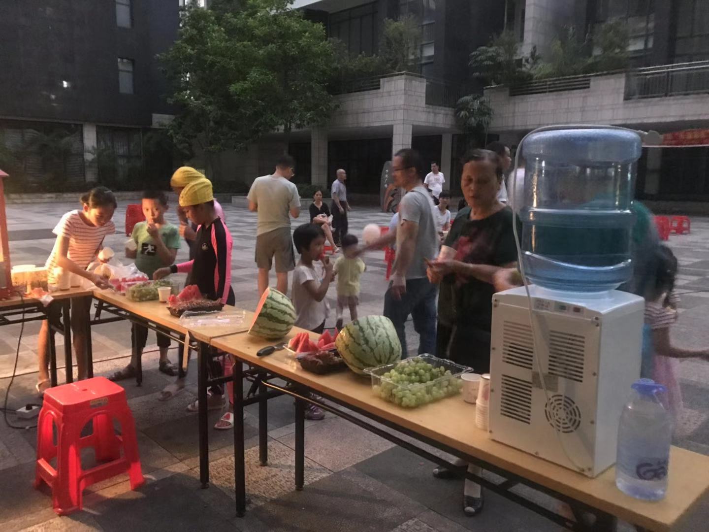 为了让业主们有个轻松愉悦的观影心情,盛世嘉物业倾情为业主们设立了服务区,给前来观影的业主免费提供水果、饮品、零食、礼品还有小朋友们最爱的爆米花。