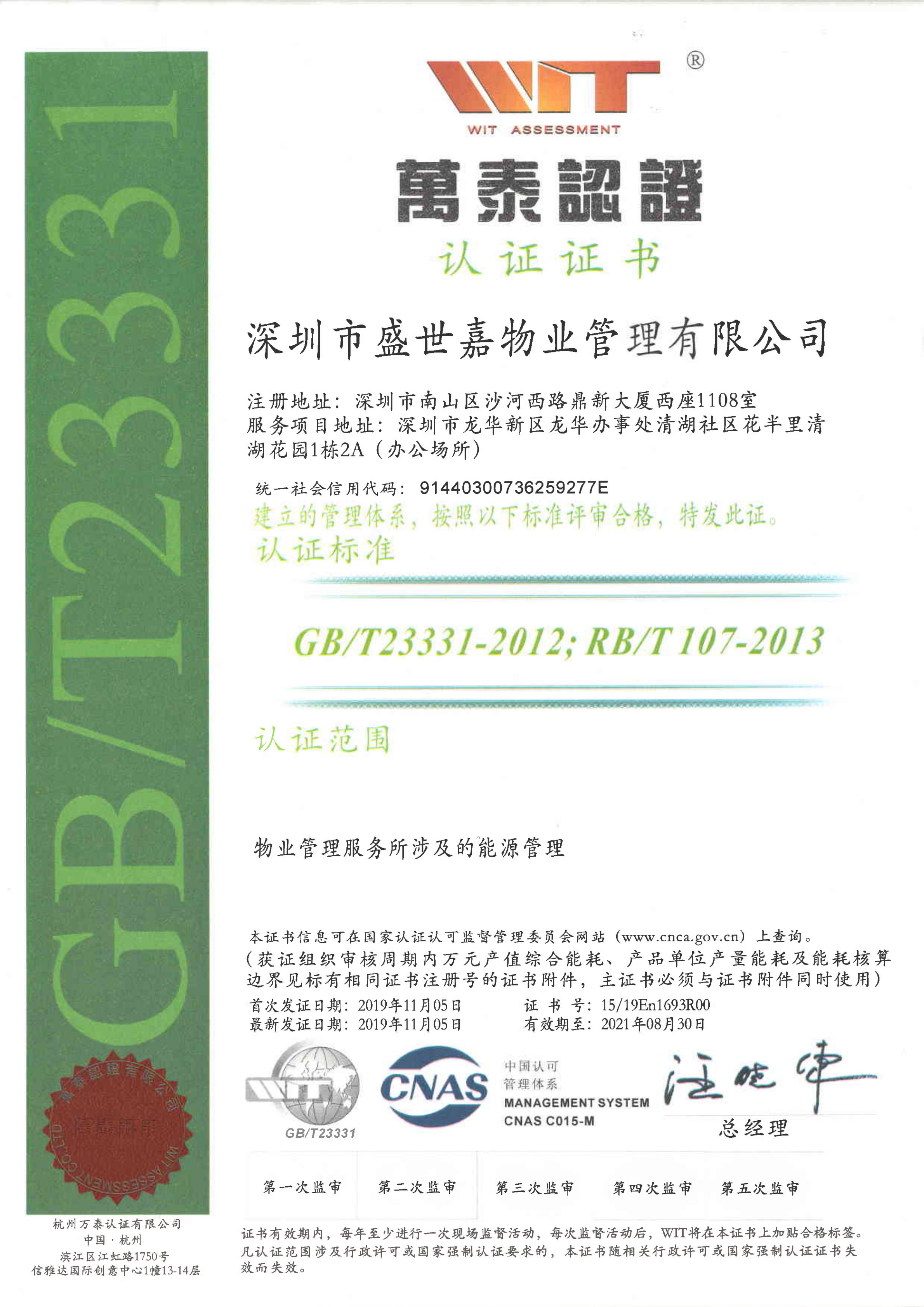 11月,盛世嘉物业完成能源管理体系认证审核工作,并取得认证证书,体系涵盖范围:物业管理服务所涉及的能源管理。