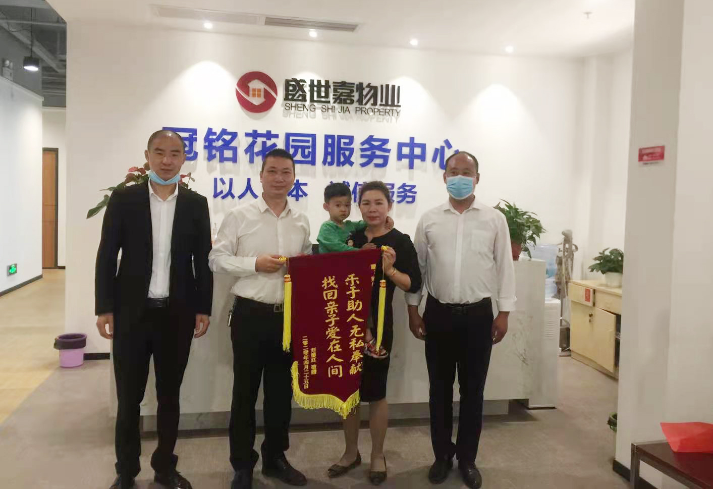 2020年4月12日,一位茶光居民的孩子在商业街玩耍时和家人走散了。我们的安管员在巡逻时发现了有位小朋友在商业街哭泣,为了保证孩子安全,安管员把小孩带到岗亭,安抚小孩并立刻安排队员在小区里发布通知,并在现场巡查是否有在找孩子的住户。经过一番努力,找到了一位着急的女士,工作人员仔细核查,确认该女士为孩子的母亲。孩子母亲为表感谢特送来“乐于助人,无私奉献,找回亲子,爱在人间”锦旗一面。
