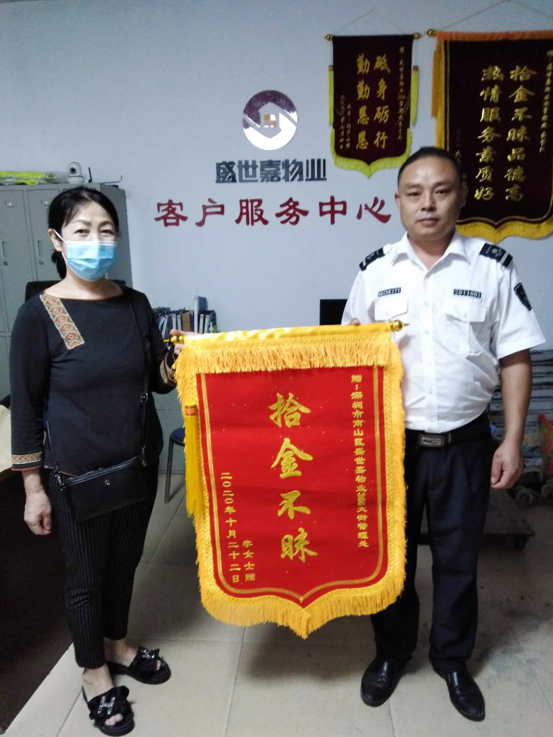 不久后管理处主管等来了失主的电话,便通知她来管理处领取失物。丢失手机的失主是一位奶奶,李奶奶告诉我们,儿子儿媳结婚10年后才等来一个宝贝孙子,她用手机记录孙子成长的点点滴滴。对她来说手机不值钱,但这些回忆是无价,非常感谢我们。过了两天,李奶奶送来了一面“拾金不昧”的锦旗特以致谢。