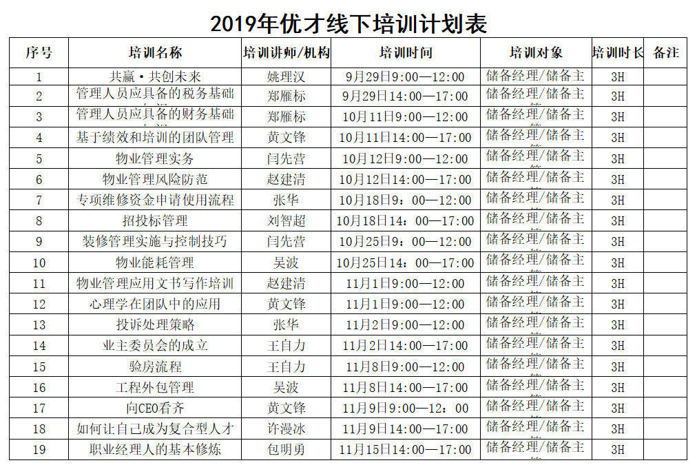 主讲的讲师是由公司的高层领导、各职能中心经理、各项目负责人组成的培训讲师队伍,他们有着丰富的现场管理经验,以及各种突发事件的应急处理方法,培训课程涵盖物业工作中的各个板块,共19门课程,57个课时。